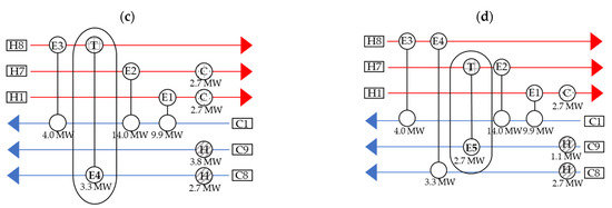 In Configuration 1, the C1 stream needs to be heated from 10 °C to 121 °C. C1 is connected to two exchangers. Subsequently, the amount of energy required by C1 is 4.0 MW. A heat exchanger connects C1 and H8, where 4.0 MW of heating and cooling duty is covered. H8 still has waste heat energy; therefore, a heat exchanger is attached to H8 in Configuration 2. In Configuration 2, the C8 stream needs to be heated up from 79.4 °C to 83.8 °C. A heat exchanger connects C8 and H8, and 3.3 MW of heating and cooling duty is covered. In Configuration 3, the C9 stream needs to be heated from 82.7 °C to 88.0 °C. A heat exchanger connects C9 and H7, and 2.7 MW of heating and cooling duty is covered. The results of the HEN are shown in Figure 5.