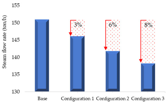 Decrease in the steam flow rate for Configurations 1, 2, and 3 compared to the base case.