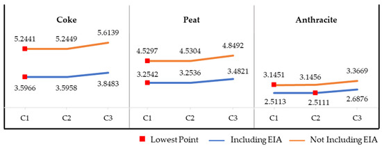 The payback periods for Configurations 1, 2, and 3 are 5.66 months, 5.73 months, and 6.15 months, respectively. The lowest payback period was achieved with Configuration 1, which provided the fastest return on investment, at 5.66 months. Therefore, Configuration 1 is the most economical. From the point of view of the environment, producing steam by burning fossil fuels or multiple fuels in a boiler generates waste products during combustion, including SOX, NOX, and CO2, which are harmful to the environment [50]. The revenue implied by carbon dioxide is considered to be equal to the reduction in environmental damage caused by reducing steam consumption to an extent equal to that of the decrease in CO2 emissions. Therefore, when considering environmental impact, the configuration with the lowest payback period may change. The payback period taking into consideration environmental impact uses Equation (4), and the results are shown in Figure 6 as a line graph. The payback periods for Configurations 1, 2, and 3 are 4.49 months, 4.54 months, and 4.87 months, respectively. The lowest payback period is achieved with Configuration 1, which, at 4.49 months, provides the fastest return on investment. Therefore, Configuration 1 is still the most economical in terms of the economic assessment. However, when the payback period takes the steam source into consideration, this can change.