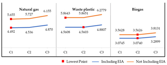 However, when the environmental impact is included, the lowest point of 6 out of 6 petroleum fuels is for Configuration 2. The payback period of petroleum fuels is significantly affected by the environmental impact equivalent to CO2 emissions. In other words, it influences fluctuations in the payback period of petroleum fuels, indicating a significant impact on CO2 emissions. When fuels are renewable, fluctuations in the payback period are divided according to the CO2 emission factor.
