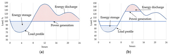 These factors bring about the necessity of creating the conditions for system load smoothening. Here, one of the prospective directions is the introduction of energy accumulation systems to stabilize the power consumption and production and to expand the controllability ranges of low maneuverability facilities [4]. These systems may cover system peak loads by using the energy accumulated during low power consumption periods (Figure 1a) or by using the constant power of the facility (Figure 1b) [5,6,7]. In the electricity market, accumulation systems may accumulate energy during the low price periods and supply it during the higher demand periods at higher electricity prices [8,9].