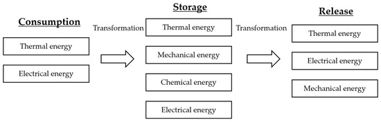 The energy accumulation principle is based on the transformation of primary energy into a form that is easier to accumulate and store as well as its further transformation into a customer-acceptable form (Figure 2). The accumulation process may consist of sequential transformation elements or of direct accumulation without transformation, for example, the accumulation of water in a municipal heat supply system. Nowadays, the methods of energy accumulation differ with the type of primary energy and storage form.