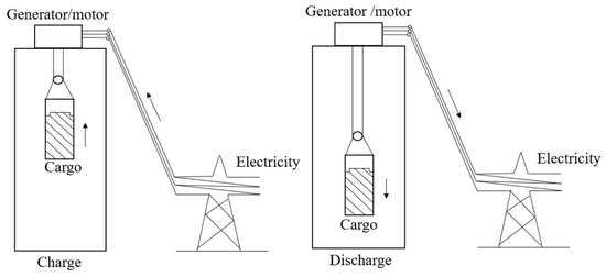 Additionally, electric energy may be transformed into the potential or kinetic mechanical energy of various solid bodies. The Figure 4 shows an accumulating facility that uses electricity to lift a massive object. This facility accumulates potential energy by lifting the load against gravity forces, with the load descending to discharge electricity production [14]. This technology can be used separately from energy systems, where the special materials are used as cargo, or it can be integrated into technological processes at facilities and enterprises where it is necessary to frequently lift and release various objects [15]. There are works that consider the use of gravitational energy storage systems with the integration of renewable energy sources [16,17]. The authors of [18] analyzed the prospect of using of a gravitational energy storage system in existing shafts of hard coal mines in Poland. The authors found that the obtained economic effects of the solution were low, and therefore there was no economic justification for activities related to its implementation.