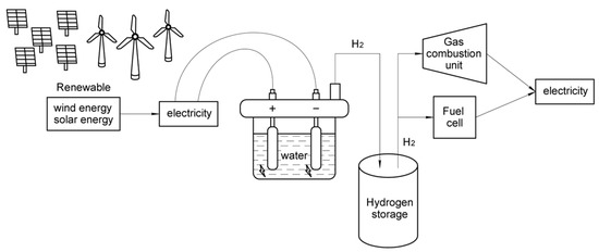 Electrolysis facilities with hydrogen fuel accumulation are also a prospective energy accumulation direction. These systems use electricity for water electrolysis and hydrogen production. The hydrogen is stored in storage systems, vessels, or natural subterranean cavities. Then, electricity is produced by hydrogen combustion in a gas turbine or in a fuel cell (Figure 7) [26]. The accumulation capacity is directly determined by the amount of stored hydrogen. The power of the facility is determined by the electrolyzer and gas turbine or the fuel cell performance.