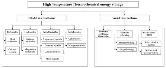 Thermochemical energy storage (TCES) systems represent a promising developmental direction. In such systems, heat is used in convertible reactions followed by heat consumption and release. In these systems, energy is accumulated via the storage of chemical transformation components. The thermochemical accumulation reactions may be between a solid and a gas where carbonates, hydroxides, metal hydrides, or metal oxides are used [39]. Additionally, the reaction may be between gases: ammonia synthesis/dissociation, methane reforming, or sulfur base reactions (Figure 8).