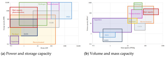 Figure 9b compares the mass and dimensional performances of accumulation systems. The mass and dimensional capacity of hydro-accumulating plants is directly determined by the pool’s height difference. These PHES parameters are comparatively low. Hydrogen, thermochemical, and thermo-capacity systems have perform better, first of all because of the high combustion heat of hydrogen or the power output in fuel cells and the heat of reversible reactions and phase transformation. Flywheel technology cannot be used for the storage of large amounts of energy.