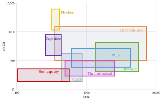 Heat capacity accumulation systems are among the cheapest type of system (Figure 10). Hydrogen and chemical accumulations are the most capital-intensive energy storage methods.