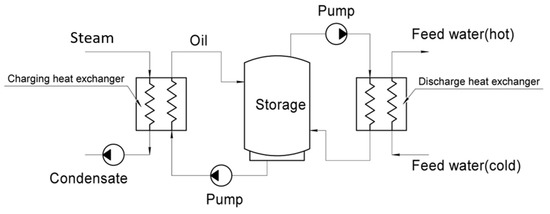 The accumulation of water heat carriers in atmospheric type tanks is limited by the 95 °C fluid temperature that prevents the water from boiling. The manufacturing and operation of high-pressure tanks is complicated, and their price is significantly higher than that of atmospheric tanks. To achieve heat accumulation at a higher temperature, it is necessary to use an intermediate accumulating heat carrier, for example, of oil (Figure 13). This method’s higher boiling temperature allows for accumulation at a higher potential heat, but this requires additional heat exchangers to transfer heat from the steam–water heat carrier.