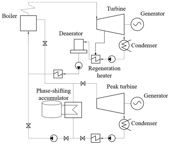 Feed water accumulation (Figure 11) is a promising option for thermal and nuclear power plants that work in water–steam cycles. During the charge period, a pump supplies an additional condensate flow from the cold condensate tank. The feed water is heated up to the given temperature by an additional heater operating on primary steam, and the steam flow into the high-pressure heater (HPH) is increased. Additionally, a drop in the boiler steam production reduces the block power. During the discharge period, the feed water is supplied from the accumulator tank into the feed water pipeline after regeneration. The excessive condensate after low-pressure regeneration enters the “cold” condensate tank. The power increase is provided by the HPH reduction or termination in the discharge regime. The accumulator tank pressure in the discharge mode is maintained by its connection with the primary steam pipeline, which prevents the water from boiling.
