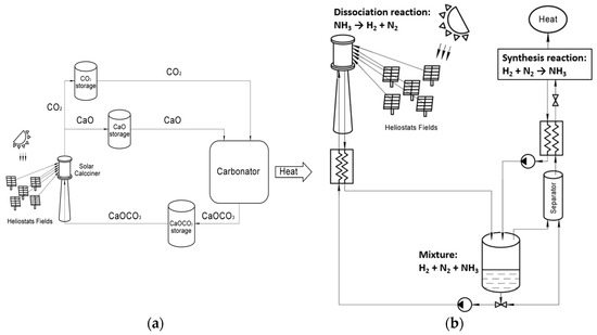 Thermochemical accumulation in a solar power plant: (a) calcium carbonate synthesis cycle; (b) ammonia synthesis cycle.
