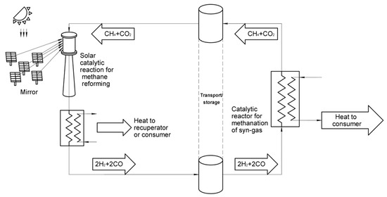 Papers [48,49] considered heat transportation and storage via methane reversible reactions, carbon dioxide, and steam reforming (Figure 16). The reforming catalytic reaction produces a synthesis gas that enters a reactor where it produces methane, carbon dioxide, and water and releases heat that is supplied to a customer. This released heat may be also used in a traditional steam turbine cycle.