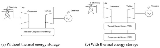 One more prospective method in gas turbines is the compressed air energy storage system (CAES). A small number of CAES facilities operate such systems successfully. Built in 1978, the CAES facility in Huntorf (Germany) was the first and simplest possible facility, with minimal power production equipment in the form of an air compressor, combustor, and gas turbine (Figure 19a). The facility efficiency was below 42%. The CAES facility in McIntosh, USA included a heat recuperation system which increased the facility efficiency up to 50–55%. In both facilities, the combustor increased the turbine inlet temperature (Figure 19b). This solution may be reasonable in the case of cheap fuel. Otherwise, it is reasonable to apply fuel-free adiabatic CAES schemes (Figure 20) [55].