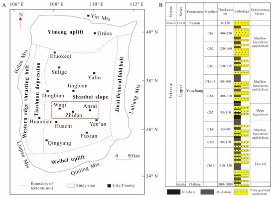 Location map and generalized Upper Triassic Yanchang Formation stratigraphy of the Ordos Basin. (A) Location of the Ordos Basin. (B) Generalized Upper Triassic Yanchang Formation stratigraphy of the Ordos Basin. Ch—Chang, Mts—Mountains.