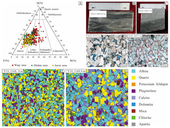 The core samples in the study area are mainly dark gray black and gray white (Figure 2B,C). Based on core observation, thin section identification (Figure 2D,E) and the spots counting methods, the results show that the quartz proportion ranges from 28.47% to 33.53%, with an average of 31.86%. The feldspar grains proportion ranges from 40.02% to 50.97%, with an average of 45.08%. The rock fragments proportion accounts for 12.8% to 19.26%, with an average of 15.27%. The rock type is dominated by lithic feldsarkose (Figure 2A).
