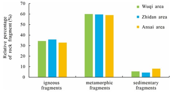 The rock fragments primarily include three types, namely, igneous fragments, metamorphic fragments and sedimentary fragments. Igneous fragments contain granite, eruptive rock and cryptocrystalline rock. Metamorphic fragments contain high metamorphic rock, quartzite, schist, phyllite, slate and metasandstone. Sedimentary fragments contain siltstone, mudstone, dolomite, limestone, chert, and so on. The rock fragments are dominated by metamorphic rock fragments, followed by igneous rock fragments, and sedimentary rock fragments comprises the lowest amount in the study area (Figure 3).