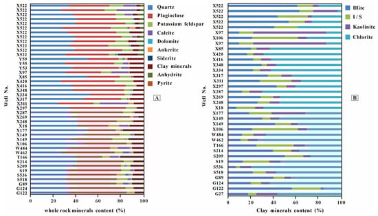 Relative percentage of minerals of Chang 8 Member in the Yanchang Formation tight sandstone reservoirs in study area. (A) Characteristics of mineral composition of whole rock. (B) Characteristics of mineral composition of clay minerals.