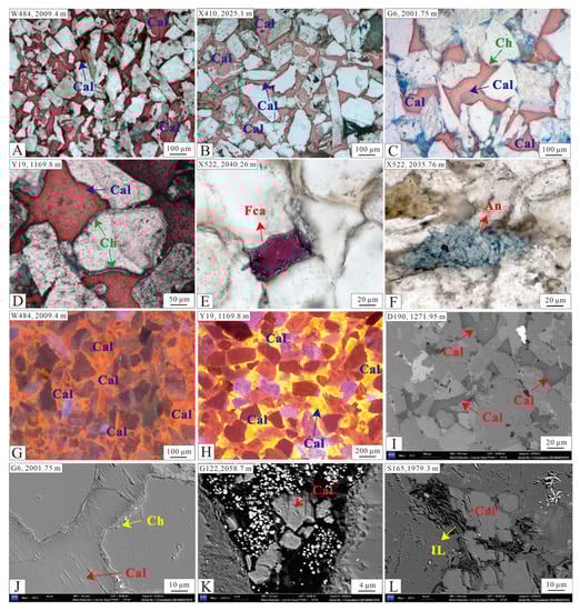 Carbonate cementation is the primary cementation of the Chang 8 tight sandstone reservoir in the study area. Based on observation and identification of thin sections, it was concluded that there are mainly four types of carbonate cements: calcite, ferroan calcite, dolomite and ankerite. The content of ferroan calcite, ankerite and dolomite is low; they only occur in a few depth intervals of some wells (Figure 5E,F). The carbonate cements in the study area are dominated by calcite cements (Figure 5A–D). Calcite cements usually present porous cementation or basal cementation. In some sandstone intervals, calcite cements are distributed sporadically or dispersedly. The occurrence of calcite cements mainly contains patterns of intergranular filling, metasomatic mineral filling or filled among pores. Calcite cements indirectly contact with quartz, feldspar and other minerals through chlorite coatings, or directly contact with quartz, feldspar and other mineral particles. Some calcite cements are not surrounded by chlorite coatings (Figure 6). Around the pores, it can be seen that some calcite cements are surrounded by chlorite coatings (Figure 5C,D,J), while illite and calcite cements are associated and occur in pores (Figure 5L).