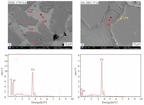 BSE images and corresponding energy spectrums characteristic of two types of calcite. (A) BSE image of type-I calcites. (B) BSE image of type-II calcites. (Cal = calcite cements; Ch = chlorite; red points represent the locations where the EDS analyses were tested).