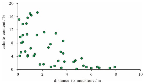 The relationship between the two types of calcite cements and the distance to mudstone is shown in Figure 7. Type-I calcite cements’ proportion ranges from 4.00% to 17.25%, with an average of 9.83%. Type-II calcite cements’ proportion ranges from 0.20–11.28%, with an average of 3.62%. The content of type-I calcite cements is obviously higher than that of type-II calcite cements. Generally, the content of calcite cements decreased gradually with the increase in distance to the mudstone. Additionally, there is obvious negative correlation between the content of calcite cements and its distance to mudstone, which is in accord with the universal phenomenon of carbonate cementation in tight sandstone reservoirs in a lacustrine basin (Figure 7).