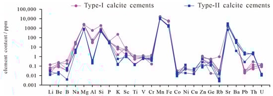 Characteristics of major elements and trace elements in two different types of calcite cements. Type-I calcite cements are from samples of W484 (2009.4 m), X522 (2041.06 m), S268 (1796.2 m), D167 (1252.1 m); type-II calcite cements are from samples of G6 (2001.75 m), S165 (1979.85 m), Y19 (1169.8 m).