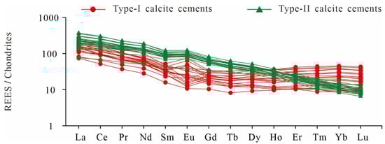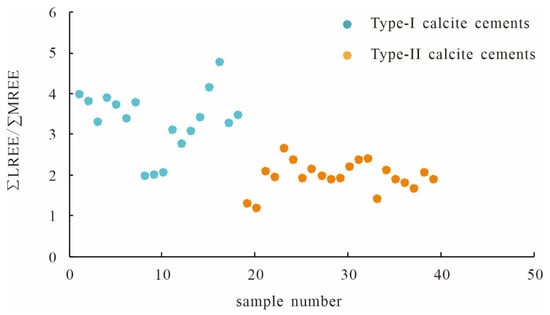 Previous studies have suggested that the binding ability of MREES with carboxylic acids is stronger than that of LREES and HREES [,]. Carboxylic acids in source rocks can carry REES into sandstone reservoirs. Thus, the value of ΣLREE/ΣHREE can be used to illustrate the relationship between REES and calcite cements. The values of ΣLREE/ΣHREE in type-II calcite cements are obviously lower than those in type-I calcite cements (Figure 16). This result indicates that the concentration of MREES in type-II calcite cements is relatively high and this may be related to carboxylic acids contained in the fluids carried by the source rock.