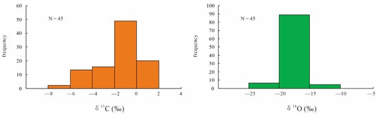Distribution frequency histogram of carbon and oxygen isotopes results of calcite cements.