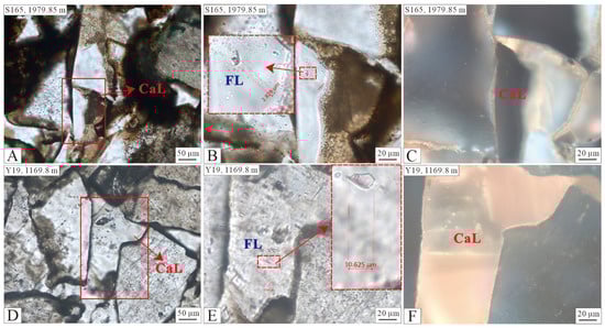 Fluid inclusions in calcite cements were observed under plane-polarized electron microscopy. The inclusions vary in shapes and sizes. Most of the fluid inclusions have two phases at room temperature: gas phase and liquid phase. The inclusions vary in size, with the range of about 2 μm–10 μm (Figure 11B,F). Some calcite cements have oil and gas attached to their surface, showing light yellow under fluorescence (Figure 11F). Other calcite cements have no oil and gas impregnation and appear dark blue under fluorescence (Figure 11C).