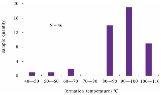 According to the calculated formation temperature data of the calcite cements above (Table 1), the overall temperature values of calcite cements in the study area range from 45 to 110 °C (Figure 12). The formation temperature values of type-I calcite cements and type-II calcite cements mainly concentrate at 45.49–89.48 °C and 91.03–108.06 °C, respectively. The temperature of calcite cements measured about 105.8 °C at room temperature, which is consistent with the formation temperature calculated by using the oxygen isotope values, proving that the method of calculating the calcite formation temperature by using the formula is reasonable.