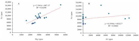 Correlation between the concentrations of Fe and Mg and Al in calcite cements. (A) Correlation between the concentrations of Fe and Mg. (B) Correlation between the concentrations of Fe and Al.