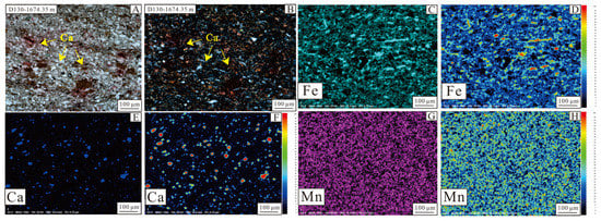 X-ray fluorescence distribution characteristics of typical types of elements in calcite cement. (A,B) Photomicrographs of thin sections under plane-polarized light (A) and cross-polarized light (B) suggesting the presence of calcite cements in mudstone sample from D130 (1674.35 m). (C–H) The distribution of typical elements of Fe, Ca, and Mn, respectively.