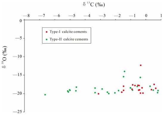 This type of calcite cementation is mainly distributed in the interior of fine-grained sandstone. The main characteristics are that the δ13C values range from −6.65‰ to 1.84‰, with an average value of −2.09‰ (Table 1). The δ13C is relatively light, obviously lower than that of type-I calcite cements, whose average value is −0.67‰. This shows that there may be an organic carbon source involved, which may be related to the decarboxylation of organic matter. The isotope results of samples from the whole study area show that the δ13C values of type-II calcite cements are obviously lower than those in type-I calcite cements (Figure 15). This suggests that the thermal decarboxylation of organic matter from source rocks is the most likely carbon source for type-II calcite cements. The domain formation temperature interval of type-II calcite cements is 90–100 °C (Figure 12). At this time, the organic matter reaches the mature stage. Carboxylic acid and CO2 released from the pyrolysis of kerogen can provide a carbon source for calcite cements of high quality. Organic acids cause the dissolution of feldspar, mica and other minerals. Ions of Ca2+, Fe3+, and Mg2+ that are released during the transformation of clay minerals can also provide an important material source for the formation of calcite cements.
