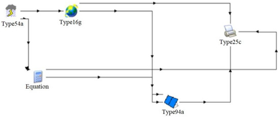 In this work, two Italian localities, Rome in the Csa (Mediterranean hot summer) Köppen climate classification and Milan in the Cfa (Humid subtropical) Köppen climate classification, were chosen [24]. In recent years, PV research has focused on both small-medium and large system sizes for different sectors in Italy [25,26,27,28]. Data on solar radiation and air temperature in past and future periods were used to calculate the hourly electrical power produced by a PV module to identify the effect of climate change on the performance of the PV module. To calculate the hourly power produced by a PV module, given the values of temperature and solar radiation, the TRNSYS software was used [29]. As shown in the TRNSYS scheme of Figure 2, the following types were used: