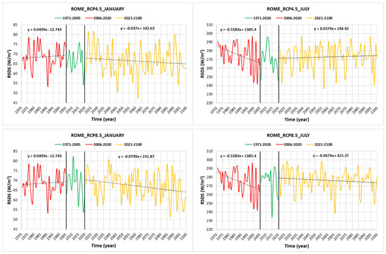 Rome’s monthly average hourly RSDS variation in January (left) and July (right) from 1971 to 2100. (Top): RCP4.5, (bottom): RCP8.5.