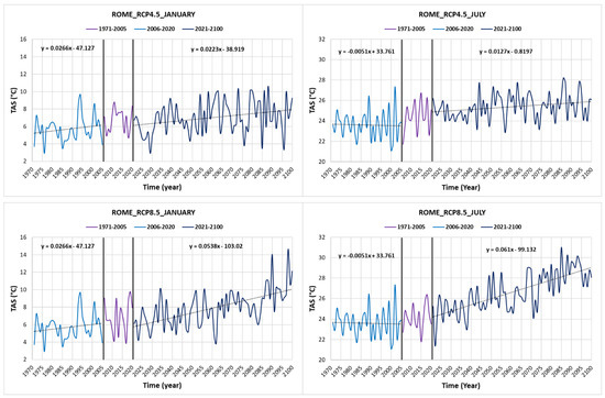 Rome’s monthly average hourly TAS variation in January (left) and July (right) from 1971 to 2100. (Top): RCP4.5, (bottom): RCP8.5.