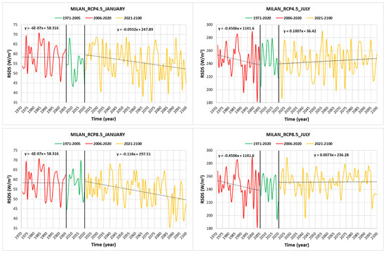 The objective of this section is to qualitatively and quantitatively study the climatic data change over the years by considering the two locations and two RCP scenarios. In particular, the monthly average hourly data of solar radiation and air temperature in January and July from 1971 to 2100 are shown in Figure 3 and Figure 4 for Rome and Figure 5 and Figure 6 for Milan. The different trends between the past and future periods were highlighted. The curve was differentiated by three different colours: the first to represent historical data from 1971 to 2005, the second to represent past simulated data from 2006 to 2020 and the third to represent future data from 2021 to 2100. In addition, the regression line was plotted, calculating the angular coefficient for the past and future periods.