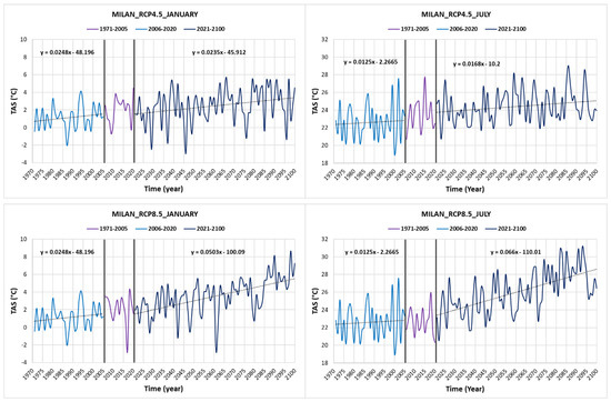 Milan’s monthly average hourly TAS variation in January (left) and July (right) from 1971 to 2100. (Top): RCP4.5, (bottom): RCP8.5.
