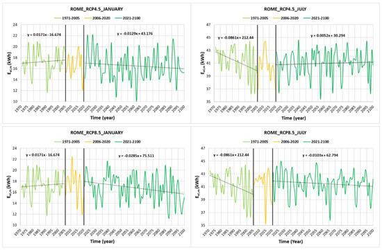 Rome’s monthly PV electricity variation in January (left) and July (right) from 1971 to 2100. (Top): RCP4.5, (bottom): RCP8.5.