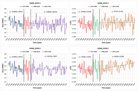 Rome’s yearly PV electricity variation (left) and yearly PV efficiency variation (right) from 1971 to 2100. (Top): RCP4.5, (bottom): RCP8.5.