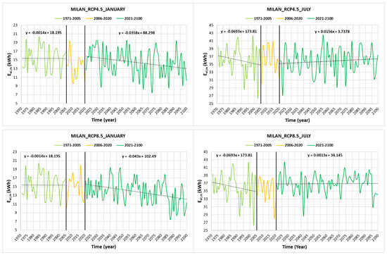Milan’s monthly PV electricity variation in January (left) and July (right) from 1971 to 2100. (Top): RCP4.5, (bottom): RCP8.5.