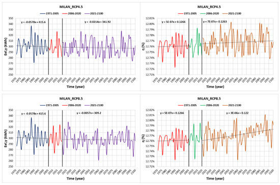 Milan’s yearly PV electricity variation (left) and yearly PV efficiency variation (right) from 1971 to 2100. (Top): RCP4.5, (bottom): RCP8.5.
