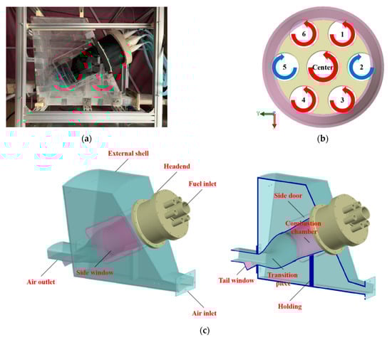 The side door of the external shell can be opened, and the headend with the swirl nozzles can be removed. The design of these two components is vital for successful PIV investigation. On the one hand, TiO2 was used as tracer particles in this experiment; the windows, headend and chamber were contaminated after measuring each section. The side door and removable combustor headend design enables the cleaning of the windows, headend and chamber. On the other hand, the design of the two parts makes it possible to spray black matte paint on the headend and the chamber’s inner face to eliminate flare and blooming; further discussion of this design can be found in Section 2.3.