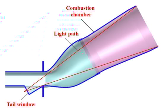 The tail window on the transition piece was designed according to the light path. The tail window was located on the axis of the combustor, perpendicular to the axial direction, and its position was carefully chosen to achieve the maximum measuring area. This design is innovative because it partially solves the problem of transition piece blockage. The geometric relationship between the tail window and the combustion chamber is shown in Figure 2.
