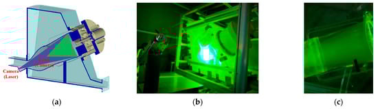 When measuring cross-sections, the laser penetrated the combustion chamber from the side window, and the camera was placed behind the tail window. The laser plane is perpendicular to the camera, as shown in Figure 3a. The laser passed through three layers of glass to reach the camera, which recorded the particle signal. The cross-section measuring scene is shown in Figure 3b.