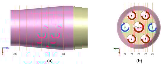 In this paper, 8 cross-sections and 9 longitudinal sections were measured. The cross-section positions H1–H8 are shown in Figure 4a, and longitudinal sections Z1–Z9 are shown in Figure 4b. The cross-sections were parallel to the x–y plane, while the longitudinal sections were parallel to the x–z plane. The longitudinal section crossed each nozzle’s center to prove the generation of recirculation zones.