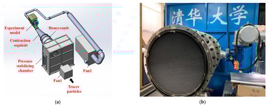 The air was supplied by two fans in this experiment, as shown in Figure 5a. Fan 1 blows the air into the system and fan 2 draws the air out of the system. Only fan 2 is used when the air flow required for the experiment is less than 1 kg/s, and all fans are used when the air flow required is larger. The air drawn out of the system produces less vibration than the air blown in. Moreover, when only the suction fan works, the internal and external pressure of the model’s external shell is basically the same, which reduces the strength requirements of the shell and lowers the risk of damage. Between the pressure-stabilizing chamber and the contraction segment, there is a honeycomb which serves to stabilize the flow, as shown in Figure 5b.