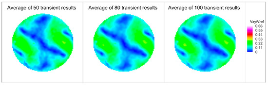In the PIV measurement system, a NEWWAVE Nd: YAG laser pulse system was selected to provide the laser beam, the maximum output energy of which was 200 mJ/Pulse. The resolution of the camera was 2048*2048. A Nikon 28 mm F/2.8D lens was used. The time interval between two frames was 10 μs, and the shooting frequency was 3 Hz. Because of the use of solid particles, the number of photos obtained per shot was limited by the contamination of the experiment model. The average results of 50, 80 and 100 transient velocity field results were very close, as shown in Figure 6. This indicates that average of 100 transient results was sufficient for mean velocity field acquisition.