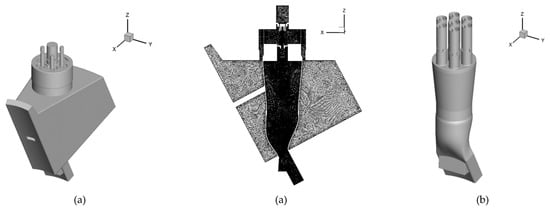 Two geometry models were studied in this study, namely the overall model and the partial model. In the overall model, the computational domain was perfectly consistent with the experimental model, with 58.25 million tetrahedron cells. In the partial model, the complex structure of plenum and headend was removed to simplify the computational domain, and the premixing tube was prolonged to ensure a completely developed turbulence upstream the swirler. The cell number in the partial model dropped to 51.86 million. The two selected models are shown in Figure 8.