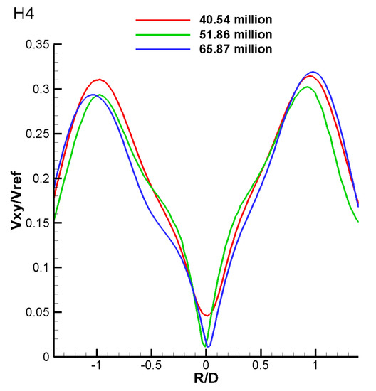 In order to testify the grid independence, 3 different meshes were built for the partial model under the separate cell base sizes 0.22 mm, 0.2 mm and 0.18 mm. The total cell numbers for these meshes are 40.54 million, 51.86 million (mentioned above) and 65.87 million. In addition, 2-D velocity distributions on a selected diameter on H4 were used to compared with each other, as shown in Figure 9. The mesh with 51.86 million cells was sufficient for the simulation since the compared results were close to each other. (Vxy stands for velocity on the x–y plane, Vref stands for the velocity magnitude in the premixing rube and D stands for the diameter of the central nozzle).
