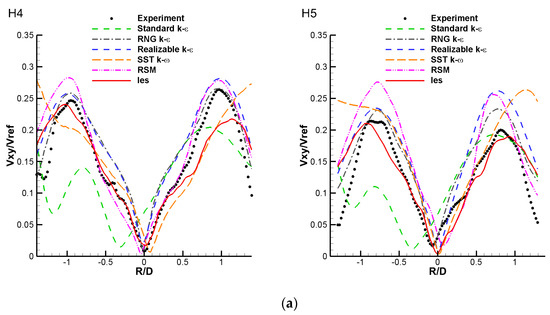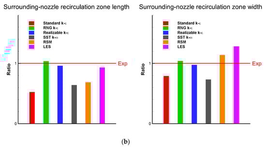 Comparison of different turbulence models. (a) Vxy on selected diameter of H4 and H5; (b) Surrounding nozzle recirculation zone size.