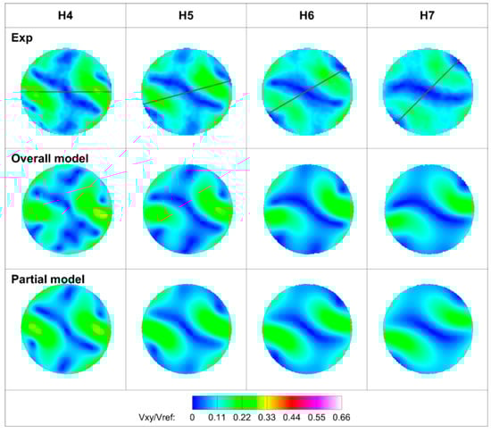 Section H1 was the most upstream section of the combustion chamber and was closest to the headend. As a result, the background scatter affected the receiving of the particle scatter, and part of the velocity information was therefore missing. Nevertheless, it can still be seen that seven streams of swirling flow formed downstream of the seven premixing tubes, with a high Vxy. The central area Vxy of each swirl was low, indicating the existence of recirculation zones.
